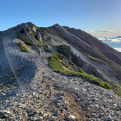 We begin this two-day fastpacking adventure in the morning at an elevation of 1,230 meters above sea level, and quickly reach our high point for the entire trek around lunchtime - 2,932 meter Mt. Shirouma. The climb up to Shirouma is largely done on a permanent snowfield through a deep valley, bordered on either side by towering peaks, and is one of the most popular and beautiful routes in the Alps. We'll crest above the snowfield and soon find ourselves surrounded by wildflowers before reaching the ridge and taking in incredible panoramic views of the Northern Alps, as well as an awe (and maybe fear) inspiring look at the long, extended ridge that lies before us and our final destination. From the summit of Shirouma we can enjoy a mostly runnable descent before another short climb to an intermediary peak. Next another runnable stretch awaits before the last, gentle climb to our campsite for the evening.